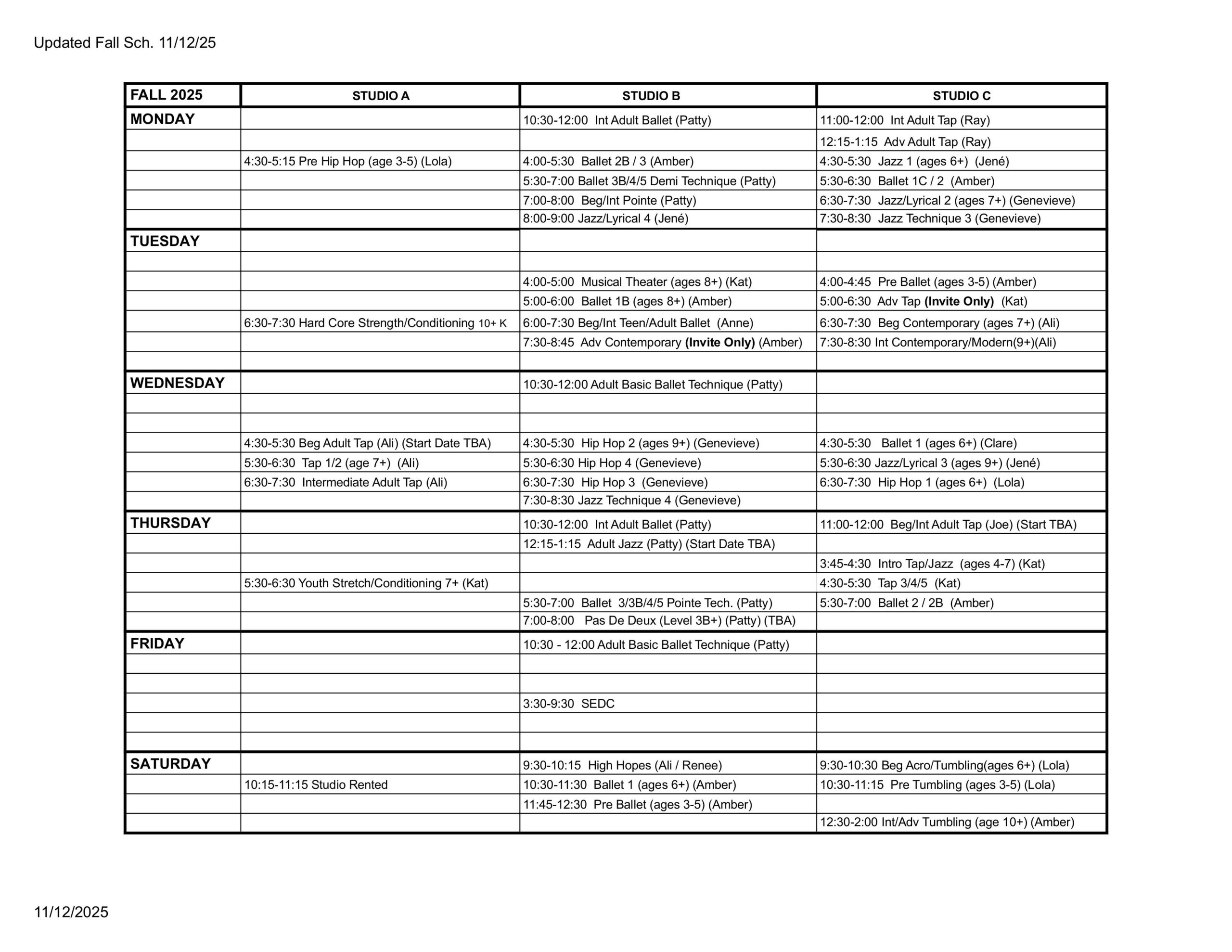 Mon 4:00-5:30 & Thurs 5:30-7:00 (Amber/Patty)