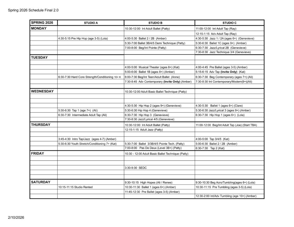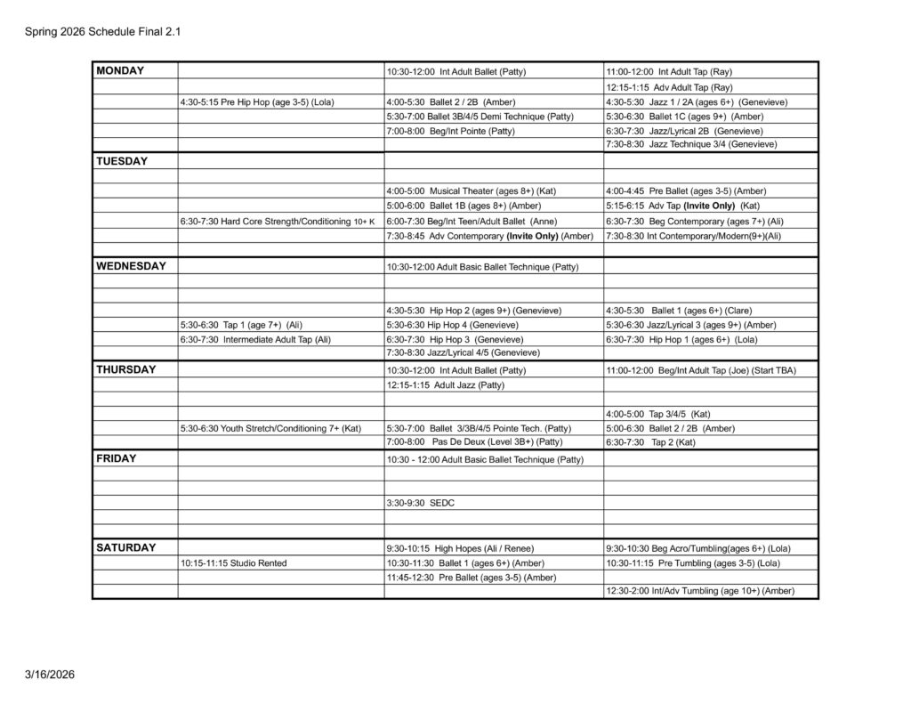 Mon 4:00-5:30 & Thurs 5:30-7:00 (Amber/Patty)